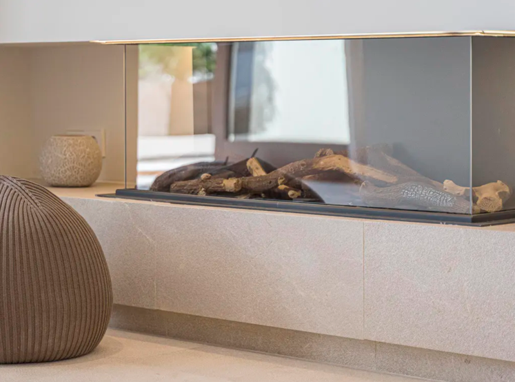 Farverne er afdæmpede og naturlige – varme sandtoner, lyst træ og natursten – som skaber ro og understreger den tidløse elegance. De massive trægulve giver rummet karakter og varme, mens pejsen tilfører sjæl og atmosfære.