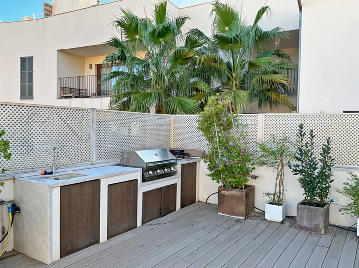 Det udendørs område er tænkt som en forlængelse af boligen og indbyder til at nyde Mallorcas 300 solskinsdage i fulde drag. Den sydvendte terrasse på ca. 50 m² er indrettet med både et overdækket loungeområde til rolige stunder, en elegant pavillon til middag under åben himmel og et fuldt udstyret udekøkken med gasgrill, kogeplade og vask – ideelt til lange sommeraftener i godt selskab.